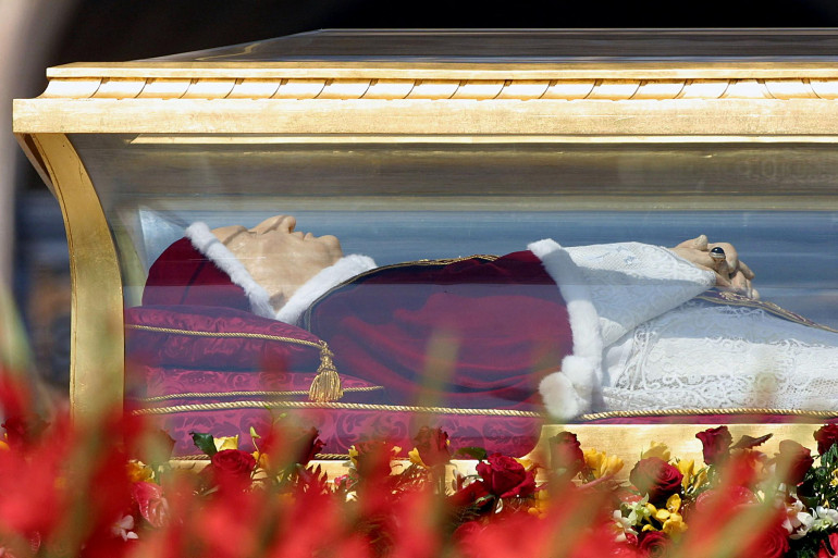 Le corps du pape François pendant le rite de la confirmation de la mort le 21 avril 2025