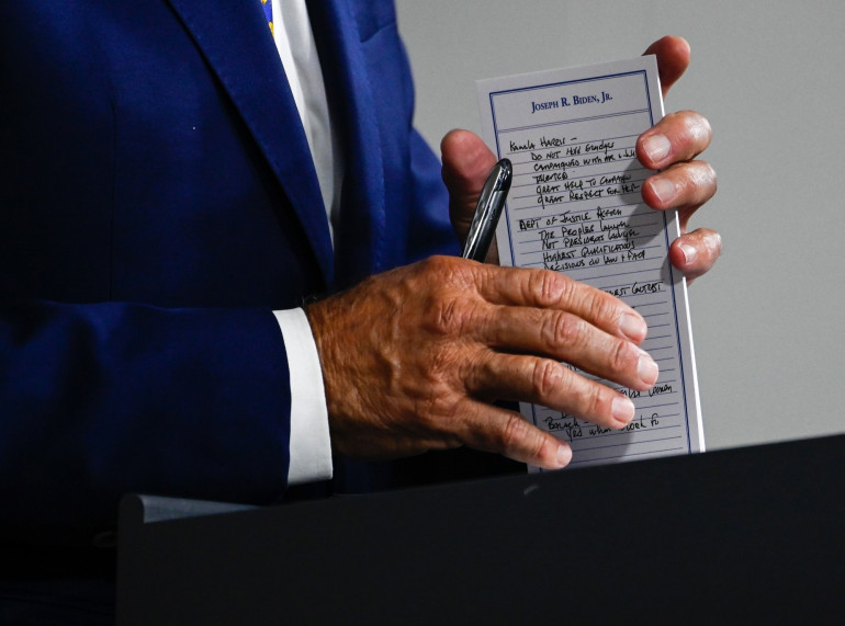 Son ex-rivale dans la primaire et seule sénatrice noire du Congrès, Kamala Harris semble en tout cas avoir convaincu le démocrate. Ce que tend à démontrer une note manuscrite prise en photo dans les mains du candidat démocrate mardi 28 juillet lors de sa conférence de presse.