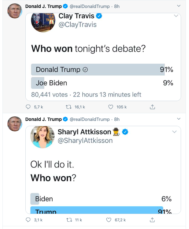 Mais à l'issue de cet ultime débat, les médias américains sont partagés sur le vainqueur. Un sondage réalisé et publié par CNN indique que 53% des électeurs qui ont regardé le débat désignent Joe Biden comme vainqueur, contre 39% pour Trump. Même son de cloche pour YouGov, qui a effectué une enquête auprès de 491 électeurs : 54% des sondés jugent que le candidat démocrate l'a emporté, contre 35% pour le milliardaire républicain. Toutefois, ces résultats n'ont pas empêché le président américain de partager sur son compte Twitter des sondages douteux, affirmant qu'il en est le grand vainqueur.