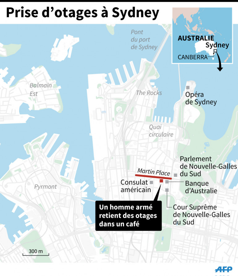 Carte de localisation du café où un homme retient des otages à Sydney.