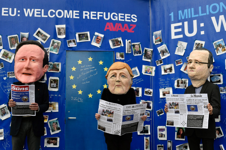 Avaaz a terminé sa petite manifestation avec des caricatures d'Angela Merkel, François Hollande et David Cameron regardant un homme paré d'un masque de Viktor Orban, le Premier ministre populiste hongrois, installer des barbelés, avant qu'"Angela Merkel" ne s'empare de pinces pour les découper.