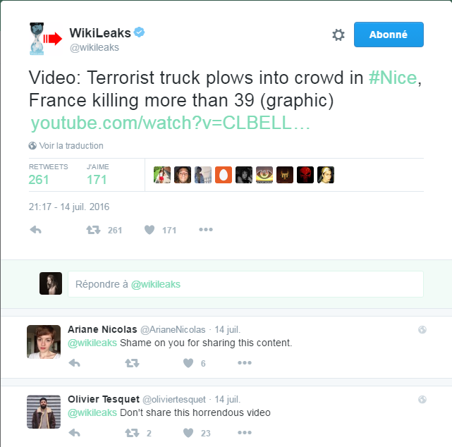 Le tweet litigieux sur la vidéo choquante de Nice publiée par Wikileaks