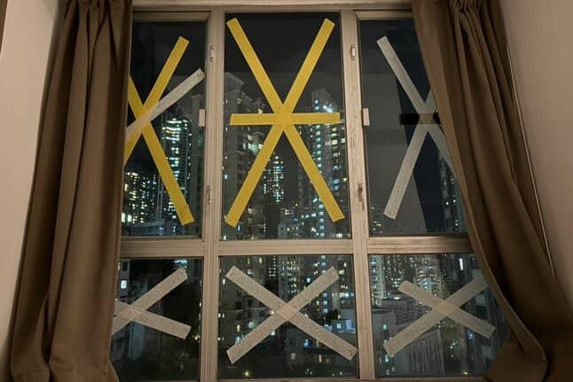 Les fenêtres des bâtiments sont recouvertes d'adhésifs en prévision du typhon Ragasa.
