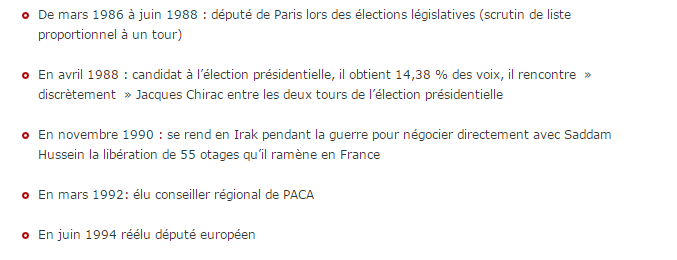 En 1990, c'est Jean-Marie Le Pen, alors eurodéputé, qui se rend en Irak, où il est reçu avec les honneurs par Saddam Hussein, alors que la France ne soutient plus le dictateur qui vient d'envahir le Koweit. À la tête d'une délégation parlementaire de huit députés des droites européennes, Jean-Marie Le Pen s'affiche en pro-irakien et annonce avoir obtenu la libération d'otages. Un fait relaté dans sa biographie affichée sur le site internet du Front national.