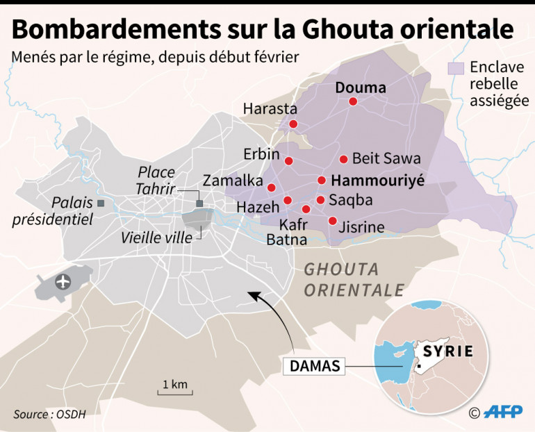Depuis dimanche 18 février, marquant le début d'un second pic de bombardements aériens dans cette enclave rebelle, 296 civils, dont 71 enfants et 42 femmes, ont été tués et quelque 1.400 blessés, selon l'Observatoire syrien des droits de l'Homme (OSDH). Plusieurs hôpitaux ont été mis hors service et les destructions sont énormes dans cette vaste région asphyxiée depuis 2013 par le siège du régime.