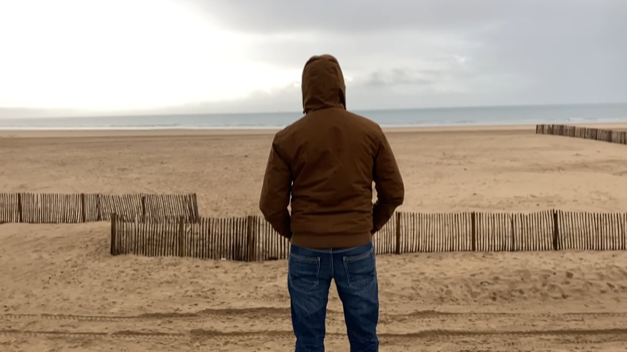 Un Iranien devant la plage de Calais qui a tenté 6 fois la traversée de la Manche sans y arriver.