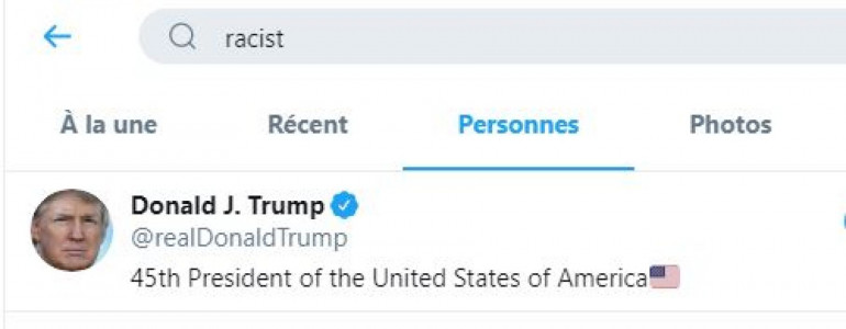Quelque chose nous dit que Donald Trump n'est pas près de se réconcilier avec Twitter. Il se trouve que ce jeudi 4 juin, lorsqu'on tape le mot "racist", (raciste en Anglais), le nom du président des États-Unis ressort en premier. En effet, en filtrant la recherche par "Personnes", vous trouverez Donald Trump au sommet de la liste.