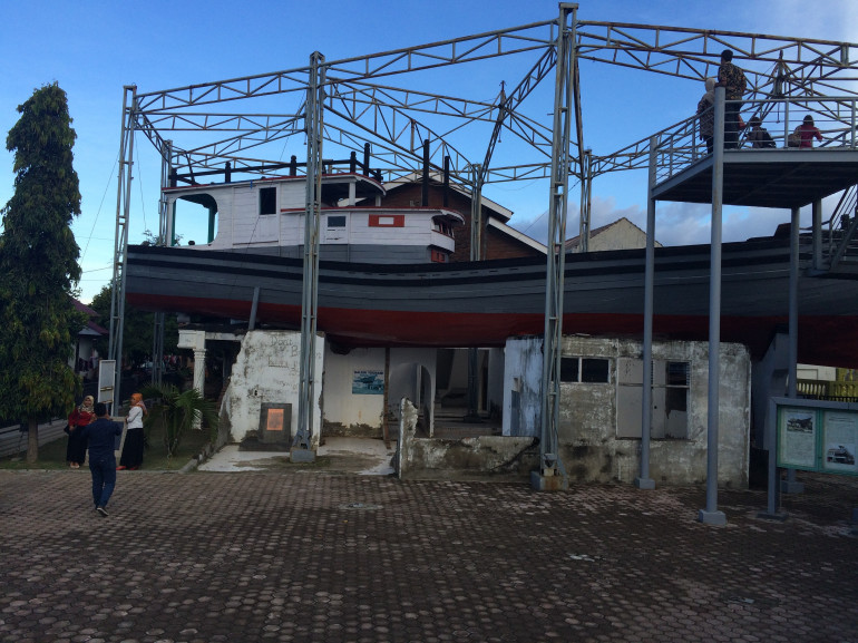 À l'aide de son mégaphone, Ahrmed guide son groupe de touristes. Nous sommes au pied de l'Apung, un immense navire industriel posé au milieu de Banda Aceh. C'est là que là que les vagues du tsunami l'ont déposé il y a dix ans, à cinq km de son port d'attache.