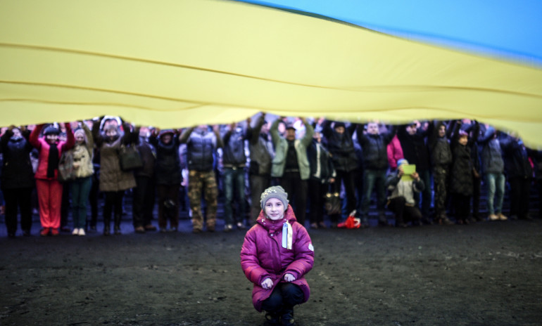 Une jeune fille pose devant un drapeau ukrainien géant.