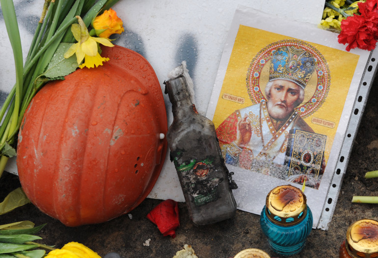 Un casque, une icône et un cocktail molotov forment un mémorial en hommage aux manifestants morts.