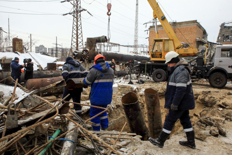 Des experts travaillent à la centrale thermique CHPP-4 de Kiev, gravement endommagée par une attaque russe à la roquette balistique à Kiev, en Ukraine, dans la nuit du 2 au 3 février 2026.
