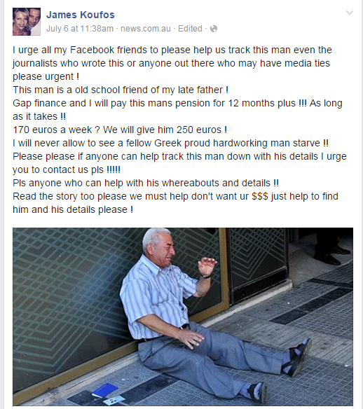 L'image a fait le tour du monde, jusqu'à devenir le symbole de la crise en Grèce et du blocage des institutions financières. Ému par l'image du retraité grec en pleurs, un financier australien d'origine grecque, James Koufos a trouvé une ressemblance avec un ami de son défunt père. Sa mère, qui vit elle aussi à Thessalonique, a confirmé qu'il s'agissait bien de lui. "J'ai dit à maman : qu'est-ce qu'on peut faire?", a-t-il confié. Giorgos Chatzifotiadis, 77 ans, avait été saisi dans sa détresse à Thessalonique, incapable de retirer la pension de sa femme après le service minimum imposé aux banques, le retraité était assis à même le sol, en larmes, son livret d'épargne et sa carte d'identité par terre.