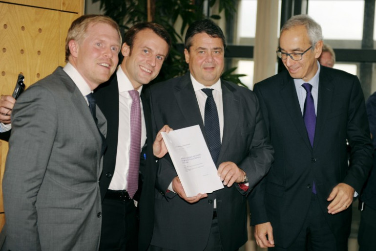L'économiste Henrik Enderlein, le ministre de l'Economie Emmanuel Macron, le vice-chancelier allemand Sigmar Gabriel et l'économiste Jean Pisani-Ferry
