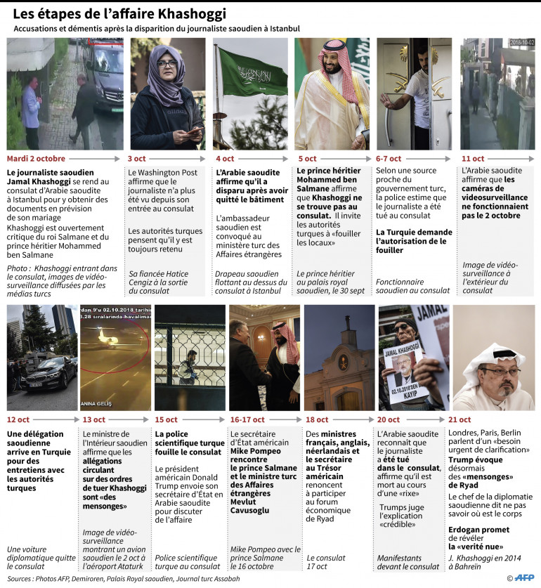 Le 20 octobre, l'Arabie saoudite lâche le morceau et confirme que Jamal Khashoggi a bien été tué au consulat d'Istanbul. "Les discussions entre Jamal Khashoggi et ceux qu'il a rencontrés au consulat du royaume à Istanbul (...) ont débouché sur une rixe, ce qui a conduit à sa mort", a déclaré l'agence de presse locale, citant le parquet. Le régime parle alors de "bavure".