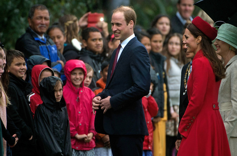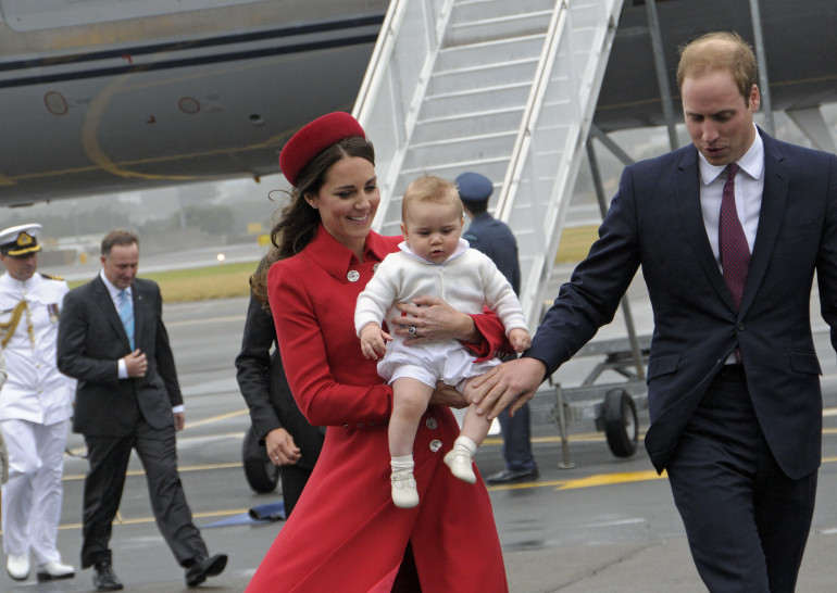 Le prince George, arrivé dans les bras de sa mère, Kate, a manqué la célèbre cérémonie d'accueil maorie pour son premier voyage officiel : il a été amené au chaud à sa descente d'avion à cause de la météo peu clémente.