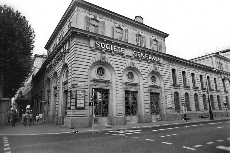 Photo datée du 20 juillet 1976 de la Société Générale à Nice dont les coffres furent cambriolés par le gang des égoutiers, le 19 juillet 1976, dirigé par Albert Spaggiari, après s'être introduit dans l'édifice en passant par les égouts.