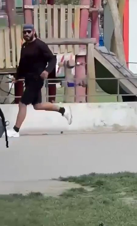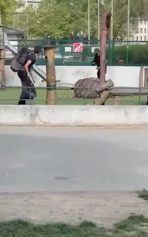 Après une énième attaque, on voit l'homme vêtu de noir, toujours avec son couteau à la main, ouvrir le portillon de l'aire de jeux pour prendre la fuite. L'homme au sac le suit et l'agresseur, qui avait ralenti considérablement le rythme de sa course, presse à nouveau le pas...