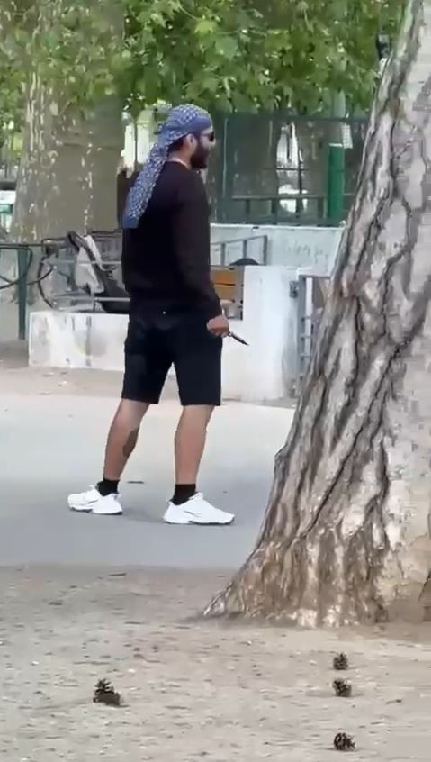 Après plusieurs attaques, l'assaillant qui porte des lunettes de soleil, semblait à court de souffle, observant son environnement direct