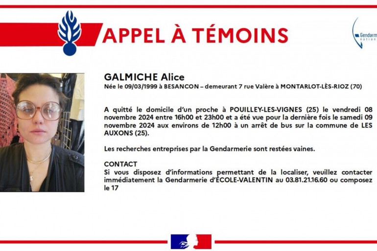 Les gendarmes du Doubs recherchent activement Alice, une étudiante de 25 ans, disparue depuis le vendredi 8 novembre au soir à Pouilley-les-Vignes. Les forces de l'ordre ont diffusé un appel à témoins ce dimanche 11 novembre.