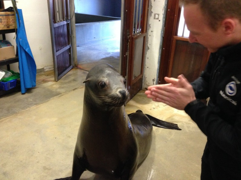 J'apprends aux lions de mer des gestes pour faciliter les soins, le jour où le vétérinaire intervient.