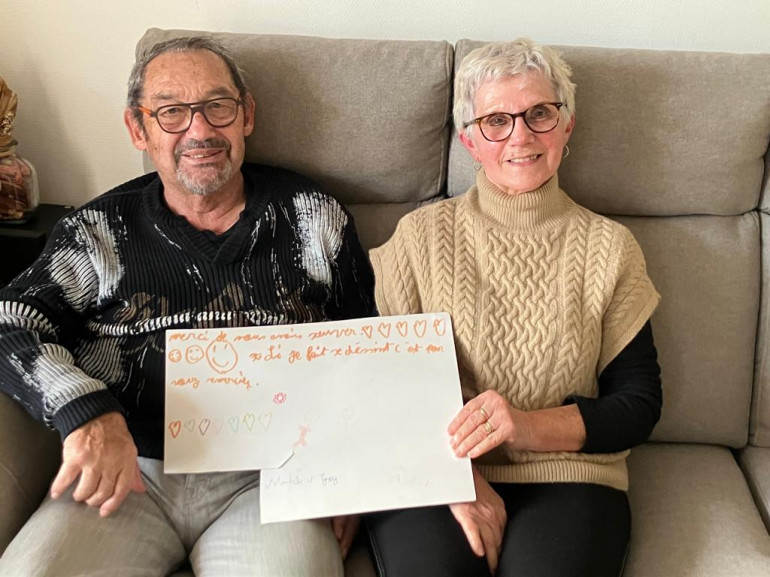 "Merci de nous avoir sauvés la vie, je fais ce dessin pour vous remercier", a inscrit le petit garçon sur la feuille de papier qu'il a rempli de petits cœurs. "Ça, c'est le plus beau des cadeaux. C'est ma médaille", reconnaît avec fierté et bienveillance Guy. "Ils savent ce qu'on a fait, ils ne nous ont pas oubliés", commentent, émus aux larmes, les deux retraités.