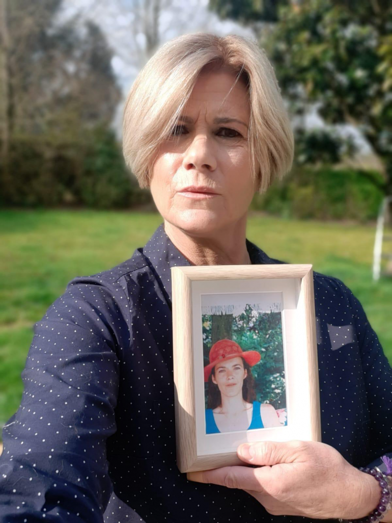 Sylvaine Grévin, qui tient un portrait de sa sœur, Bénédicte Belair, dans ses bras.