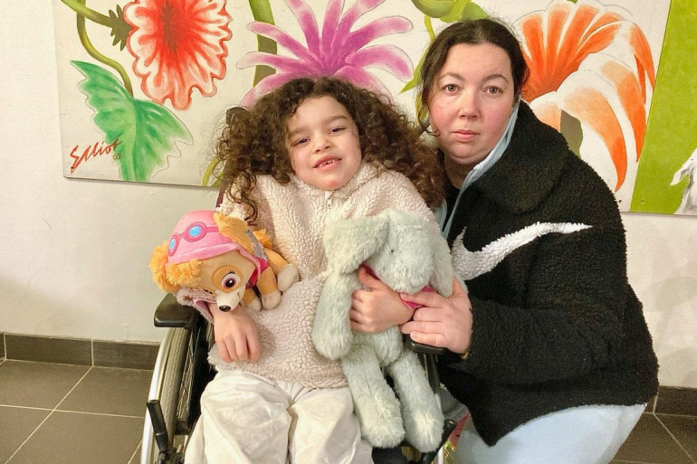 Selma, 6 ans et Claire, sa maman, à l’hôpital de Grenoble où la petite fille est soignée après l’amputation partielle de sa jambe gauche