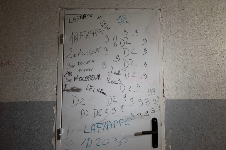 Cette photographie montre un mur portant des inscriptions faisant référence à la vente de drogues illégales et indiquant "DZ Mafia", dans le quartier de La Maurelette, situé dans le 15e arrondissement de Marseille, le 16 janvier 2026.