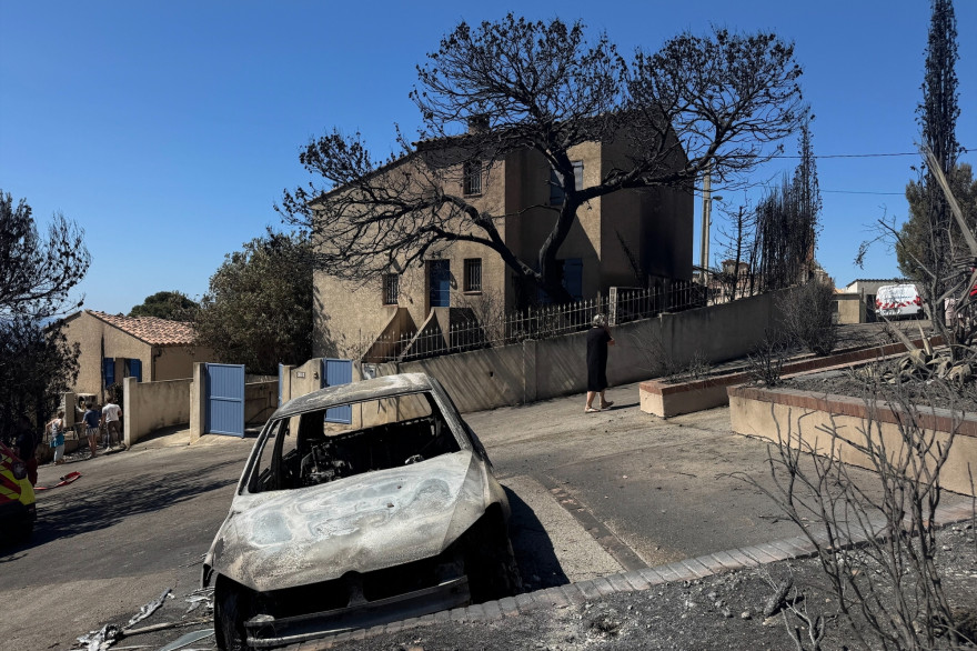 Dans la montée du quartier de l'Estaque, face à la Méditerranée, dans le nord de Marseille, une voiture est calcinée et deux maisons entièrement brûlées. Dans un jardin, trois vélos, dont une minuscule bicyclette d'enfant, ont été tordus par la chaleur.