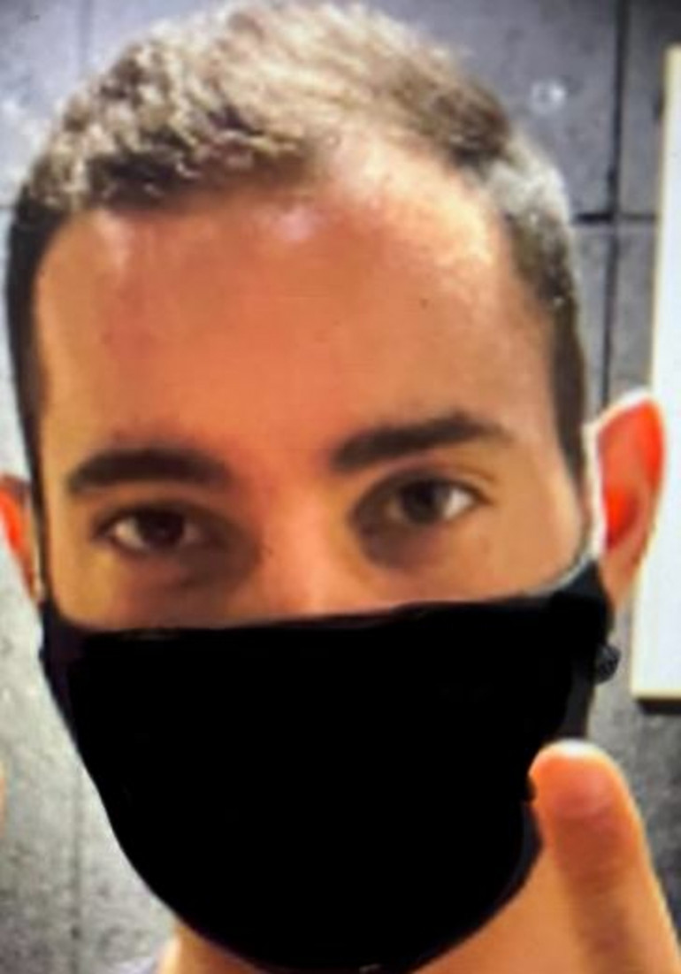 Sur la première photo, l'homme apparaît le crâne et la barbe rasés de près, vêtu d'un t-shirt bordeaux avec des lunettes de soleil accrochées au niveau du col. Sur la seconde, le policier a les cheveux courts et le visage caché par un masque anti-Covid.