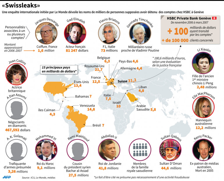 Carte localisant les 15 pays les plus impliqués dans l'affaire et liste de personnalités concernées.