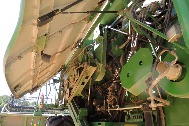 L'intérieur de la machine est plus que compliqué, mais la fiabilité progresse sans cesse et une saison de moisson se fait normalement sans panne majeure. La moissonneuse de Gaetan récolte 6 m 50 de céréales à chaque passage.
