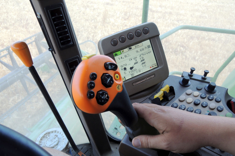 La machine se pilote confortablement et du bout des doigts ; sur l'ordinateur de bord apparaissent les rendements et taux d'humidité instantanés ainsi que les réglages de la machine selon les céréales récoltées.