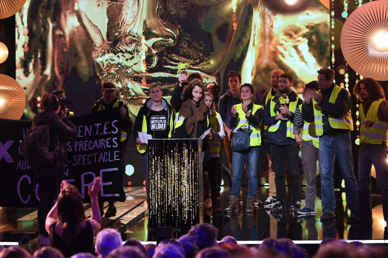 Faisant irruption des coulisses, une vingtaine de "gilets jaunes" et intermittents ont débarqué sur scène avant d'interrompre Alex Vizorek, maître de cérémonie cette année. Face au ministre de la Culture, Franck Riester, présent dans la salle parisienne, ils ont ainsi dénoncé les coupes budgétaires pour la culture.