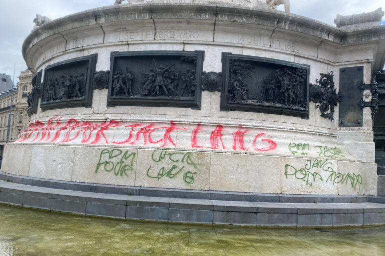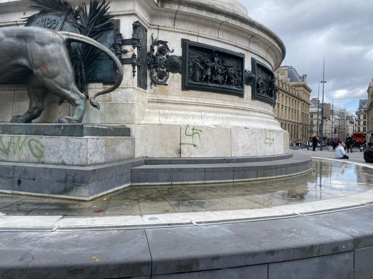 D'après les informations de RTL, la ville de Paris a indiqué porter plainte contre ces tags découverts sur la statue de la place de la République.