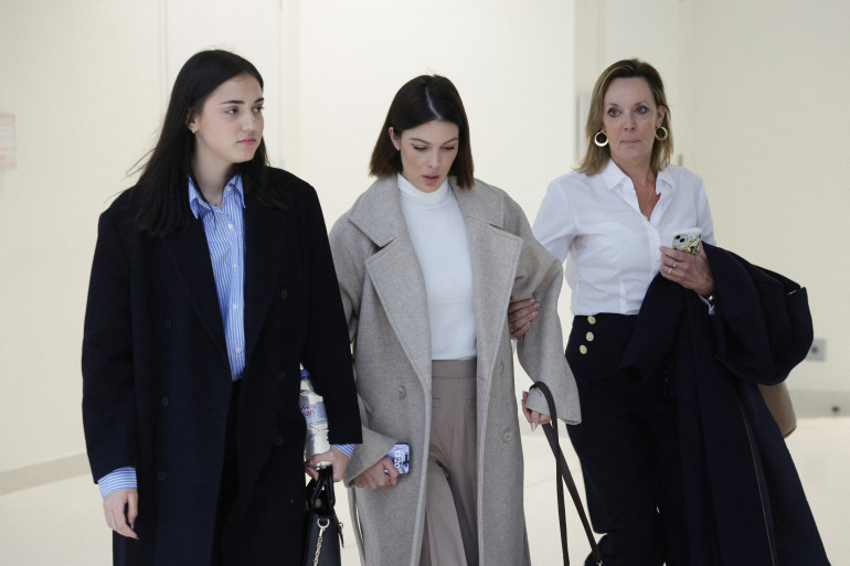 Iris Mittenaere (au centre), accompagnée de sa sœur Manon Mittenaere (à gauche) et de sa mère Laurence Druart (à droite), lors de son procès contre son ex petit ami Bruno Pelat, au Palais de justice de Paris, le 6 novembre 2024.