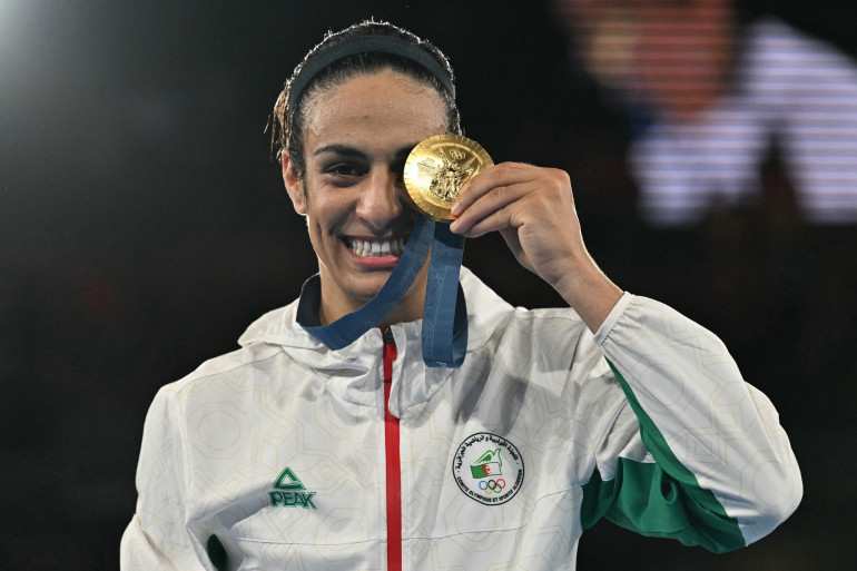L'Algérienne Imane Khelif, médaillée d'or, pose sur le podium lors de la cérémonie de remise des médailles dans la catégorie féminine des 66 kg de boxe lors des Jeux Olympiques de Paris 2024 au stade Roland-Garros, à Paris, le 9 août 2024.