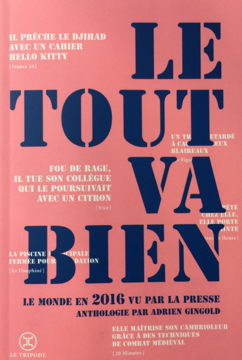 C'est un livre qui fait rire sans se moquer de personne. Un exploit, non ? Le Tout va bien édition 2016 condense notre époque. C’est un modeste recueil, mais qui va vous emmener très loin. Le mieux est de le déguster avec des amis, à haute voix. Parmi les titres sélectionnés : "Une touriste anglaise tente de regagner à la nage un paquebot parti sans elle". Vous voyez : quelques mots, et vous tenez déjà le début d'un film. Ces 136 titres piochés dans la presse cette année sont autant de pitchs, autant de début de scénarios.