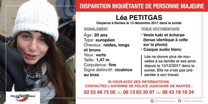 Le mardi 19 décembre, un appel à témoins est diffusé sur les réseaux sociaux par la police nationale de Loire Atlantique. Léa Petitgas est présenté comme une jeune femme aux cheveux longs et bruns, yeux verts, 1m47. Elle porte un pantalon bleu, une veste kaki, une écharpe, un bonnet blanc et a une cicatrice au bras.