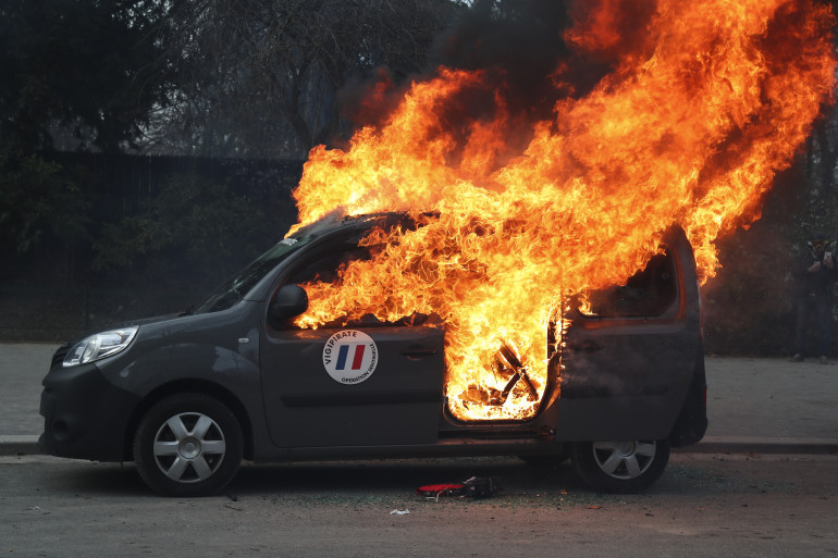 Une voiture de la mission antiterroriste militaire Sentinelle incendiée lors de l'acte 13
