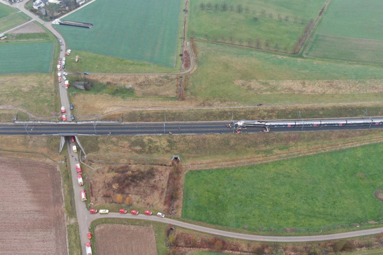 Vue du ciel du TGV qui a déraillé dans le Bas-Rhin ce jeudi 5 mars