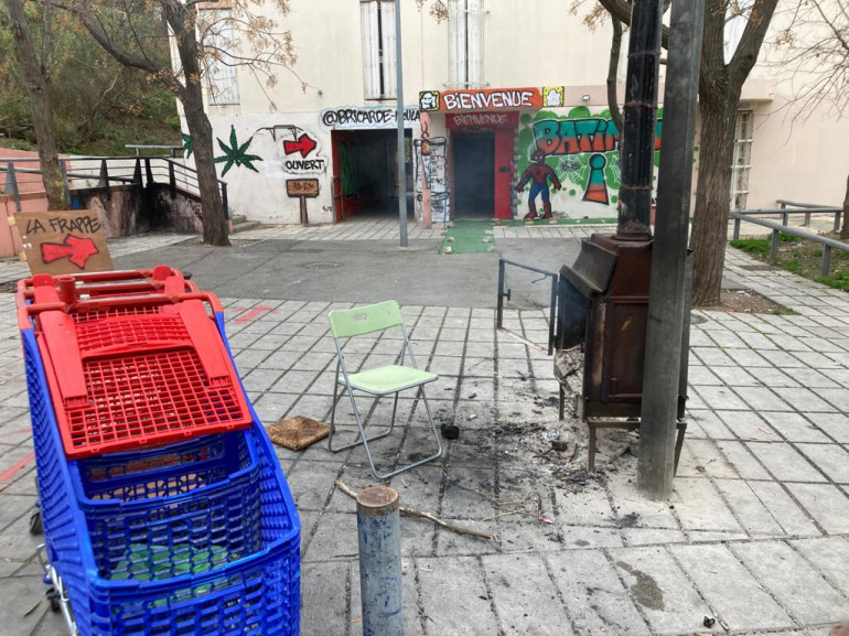 Sur le point de vente déserté, un brasero fume encore, et on peut apercevoir à côté trois caddies remplis de pierre et au fond, une immense fresque taguée sur le mur. Elle vous souhaite la bienvenue, vous donne les prix, et les horaires d'ouverture sont indiqués. On vous propose même un sens de circulation.