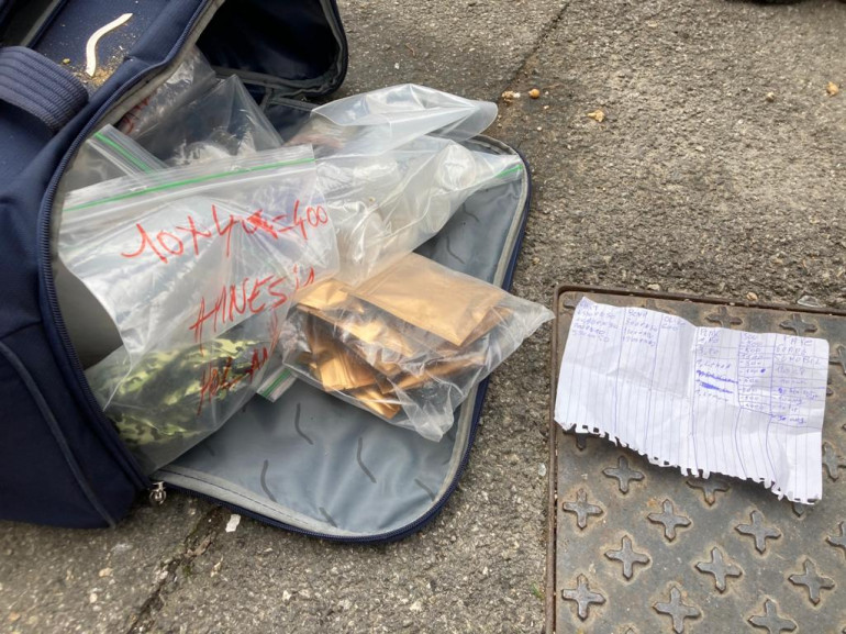 Un sac de sport rempli de produits stupéfiants conditionnés ainsi que la feuille de compte, découvert sous une plaque d’égout.