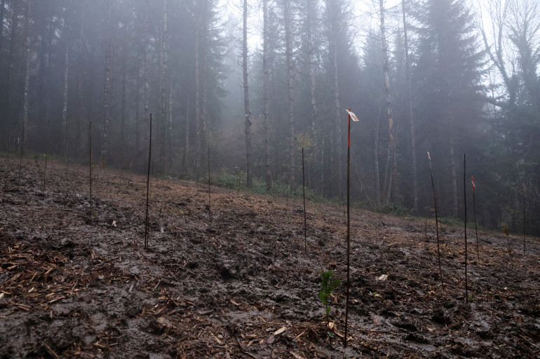 Une photographie prise le 24 novembre 2023 montre des arbres fraîchement plantés dans les forêts du Jura.