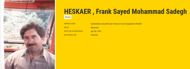 Frank Sayed Mohammad Sadegh Hesker, 69 ans, est un Danois soupçonné d'exploitation sexuelle des mineurs et pornographie infantile. Selon sa fiche eumostwanted.fr, il a eu des rapports sexuelles avec sa fille et sa belle-fille.