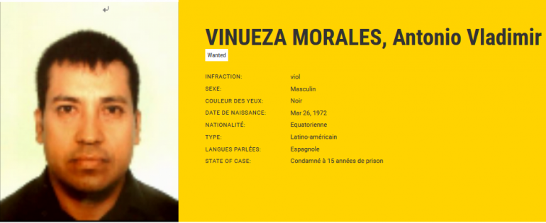 Antonio Vladimir Vinueza Morales, 48 ans, est accusé d'avoir abusé sexuellement et violé sa fille lorsqu'elle avait 10 ans. Il a pour cela été condamné à 15 ans de prison, selon eumostwanted.eu.