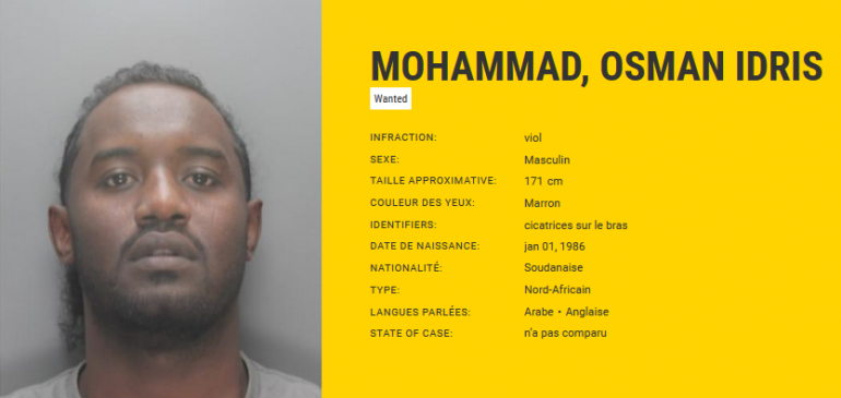Osman Idris Mohammed, 34 ans, a été reconnu coupable d'agression sexuelle. Selon le descriptif d'eumostwanted.fr, en 2015, il a tenté de violer une femme qui rentrait dans son immeuble. Il lui a retiré ses vêtements et a tenté de s'introduire dans son domicile.