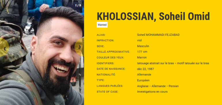 Soheil Omid Kholossian, 32 ans, est selon eumostwanted.eu soupçonné d'avoir violé en 2017 une adolescente de 16 ans à Cologne. Il se serait enfui en Iran où il serait guide touristique pour des Européens.