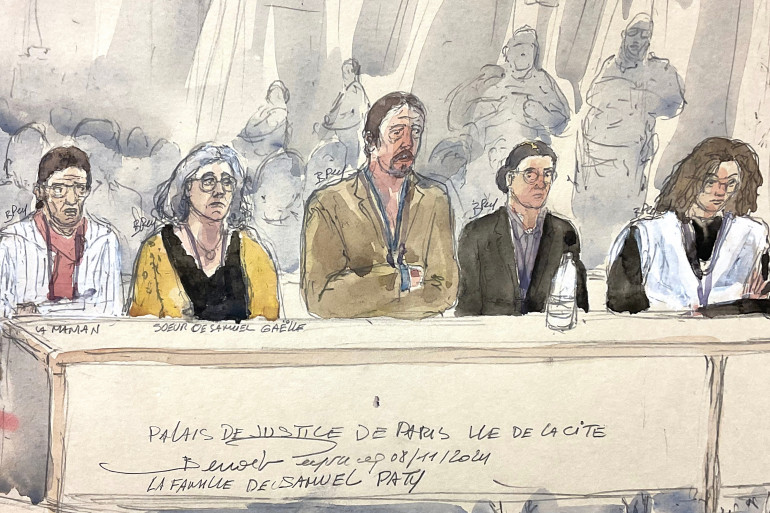Un dessin représentant les membres de la famille de Samuel Paty, lors du procès en première instance, le 8 novembre 2024.