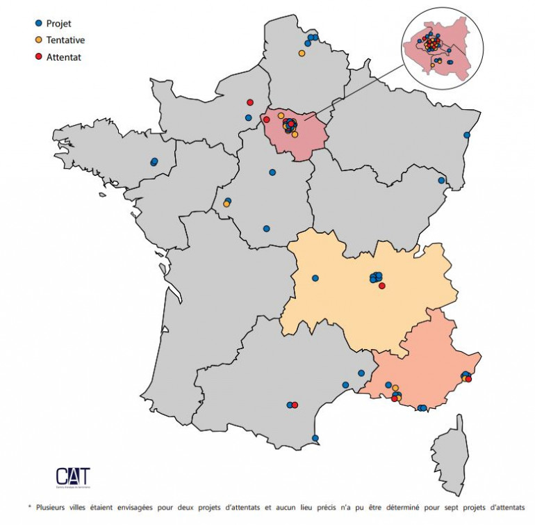 L'Île-de-France est la région la plus touchée par les actions terroristes islamistes. D'après une carte publiée par le Centre d'analyse du Terrorisme (CAT), la région parisienne est concernée à 46% par les tentatives, projets et attaques terroriste (avec les attentats de Charlie Hebdo, l'Hyper Cacher, Montrouge, le 13 novembre, Opéra...) contre 18% en Provence-Alpes-Côte d'Azur (le 14 juillet à Nice, à la gare de Saint-Charles à Marseille et encore des projets déjoués ou échoués) et 10% pour l'Auvergne-Rhône-Alpes (à Saint-Quentin-Fallavier notamment).